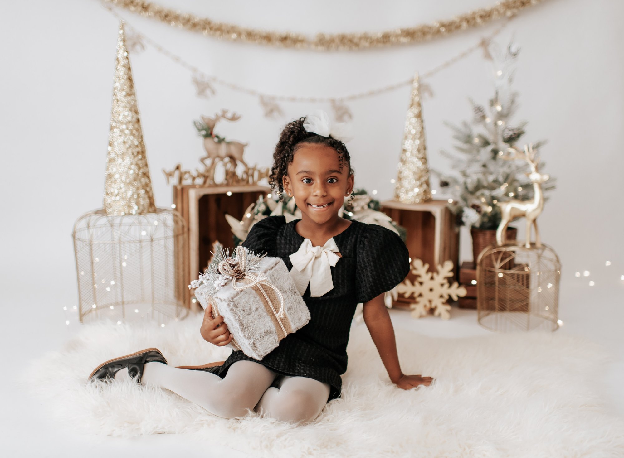 Set will be similar to the sets in the sample photos, with a few tweaks here and there. My studio has several backdrops for these minis, one will be a Holiday Bed setup, a winter wonderland with trees and a sleigh, and finally our classic Gold and White Christmas theme set up.